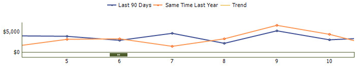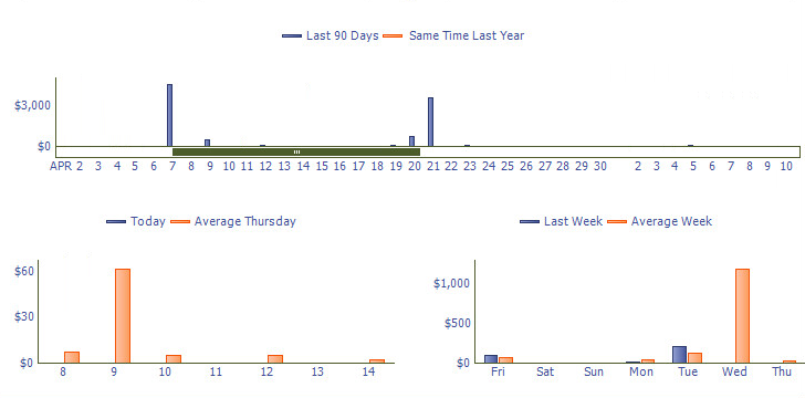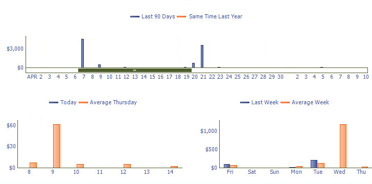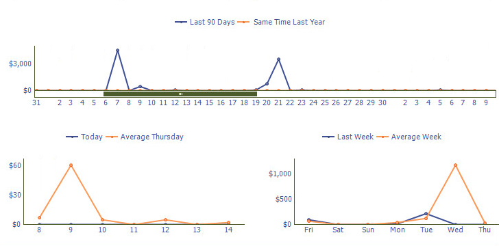 The last 90 days graph shows sales amounts for the last 90 days and also shows a comparison to the same time last year.