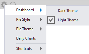 To select the Dashboard Theme, press the Cog icon located towards the top-left side of the Dashboard, then from the Dashboard menu, select the required theme.