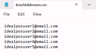 When the "Activity Log Email Addresses" option is selected, Idealpos will export a list of Email Addresses that were recorded in the Activity Log for the selected Date Range.