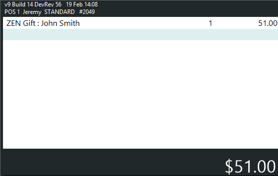 The below example shows a Gift Voucher with a Balance of $49.00 and a Recharge Amount of $51.00.