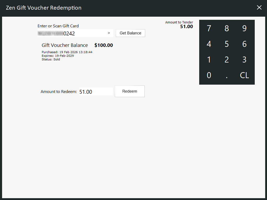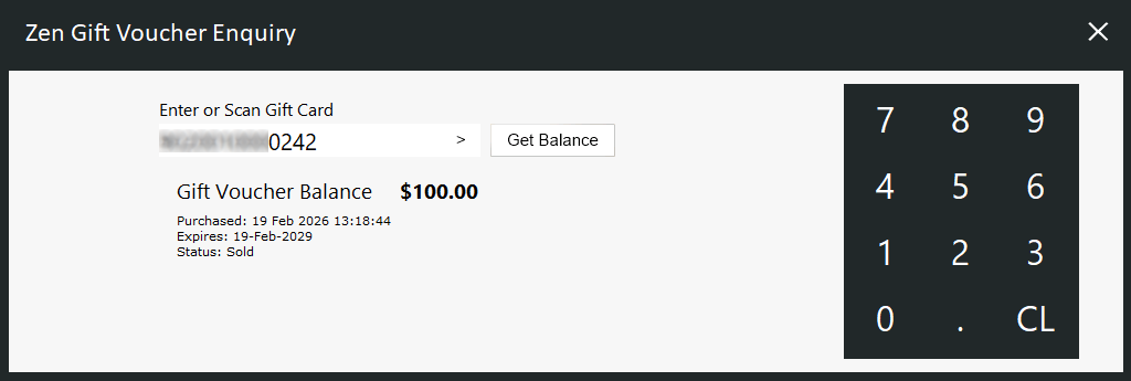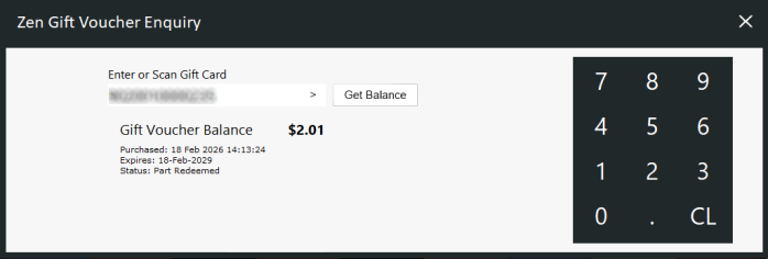 The Gift Voucher Balance will be displayed as well as any other details about the Gift Voucher (Purchased Date, Expiry Date and Status).