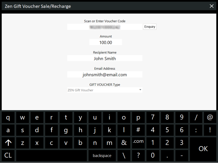 Within the Zen Gift Voucher Sale/Recharge window, enter the following details: