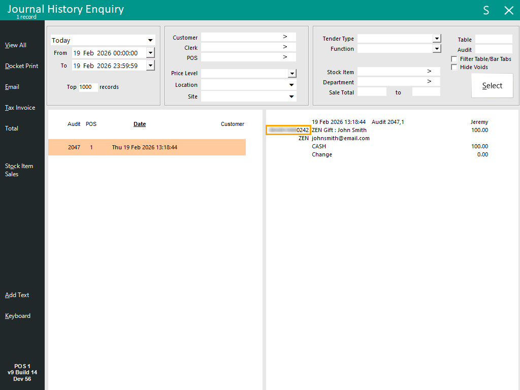 The Gift Voucher's Card Number will appear in the Idealpos Journal History Enquiry (Back Office > Enquiry > Journal History).