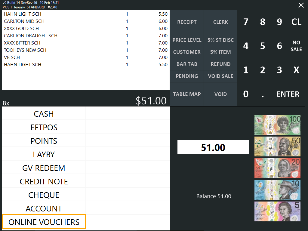 From the Tender screen, press the ONLINE VOUCHERS button.
