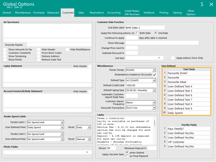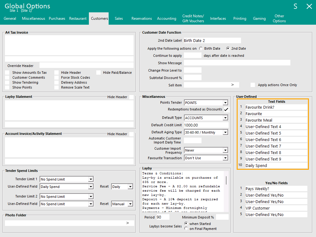 Go to: Back Office > Setup > Global Options > Customers > User-Defined.