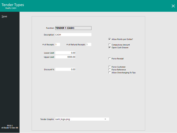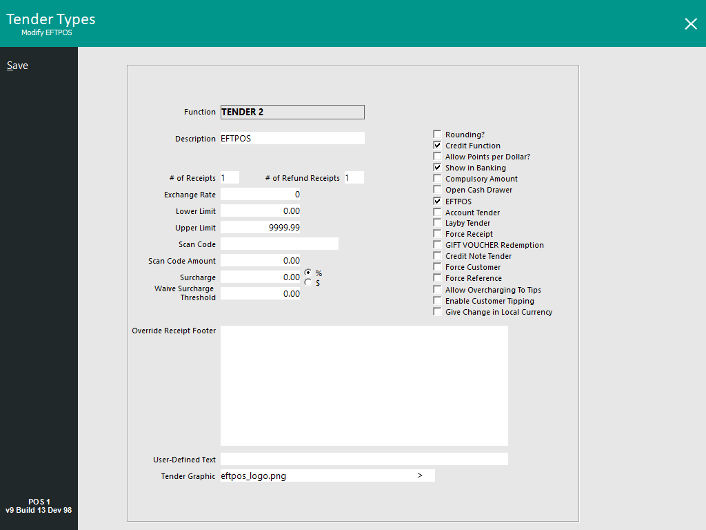 EFTPOS – This checkbox will allow the tender to use Integrated EFTPOS and perform additional EFTPOS functions.