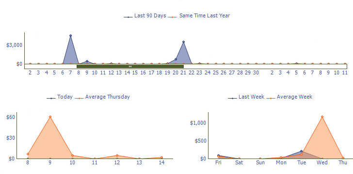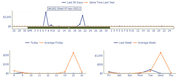 The last 90 days graph shows sales amounts for the last 90 days and also shows a comparison to the same time last year.