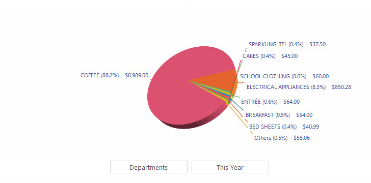 The first button on the left-hand side is used to toggle the type of data being shown in the Pie Chart (e.g. Sites, Locations, Sales Categories, Hours, Departments, POS Terminals, Tenders or Clerks)