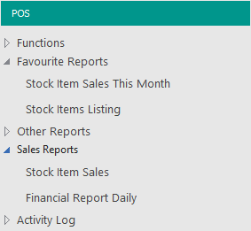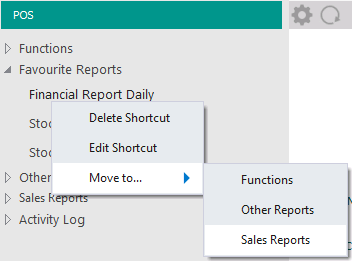 The below example shows the "Financial Report Daily" shortcut being moved from the "Favourite Reports" group into the "Sales Reports" Shortcut Group.