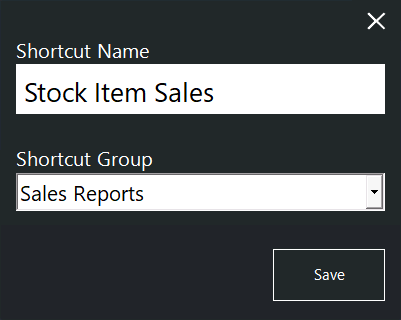 To save a report shortcut into a Shortcut Group, simply press the "S" button on the top-right corner of a report, then enter a Shortcut Name and select the required Shortcut Group from the Shortcut Group dropdown menu.