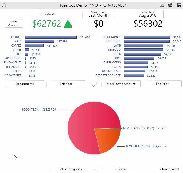 The first button (left-hand side button) controls the type of data represented (Sites, Locations, Sales Categories, Hours, Departments, POS Terminals, Tenders, Stock Items Amount, Stock Items Quantity, Stock Items Profit, Customers, Clerks).