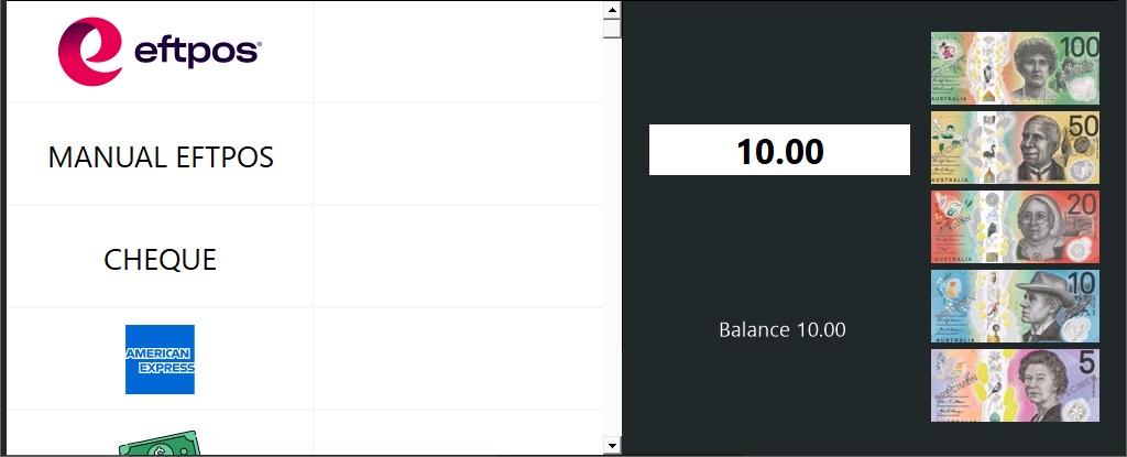 When Tendering the sale, the Tenders will be displayed in the configured order, as shown in the example below.