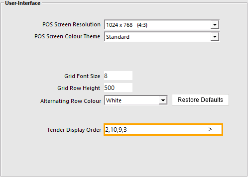 The Tender Types entered in the Tender Display Order field will be displayed at the top of the Tenders list in the order shown in this field, followed by the default order of the remaining Tender Types that haven't been specified in this field.