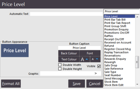 Go to Setup > POS Screen Setup > POS Screen > Layouts > Buttons > blank button > Price Level function > Enter the price level code in the automatic text field.