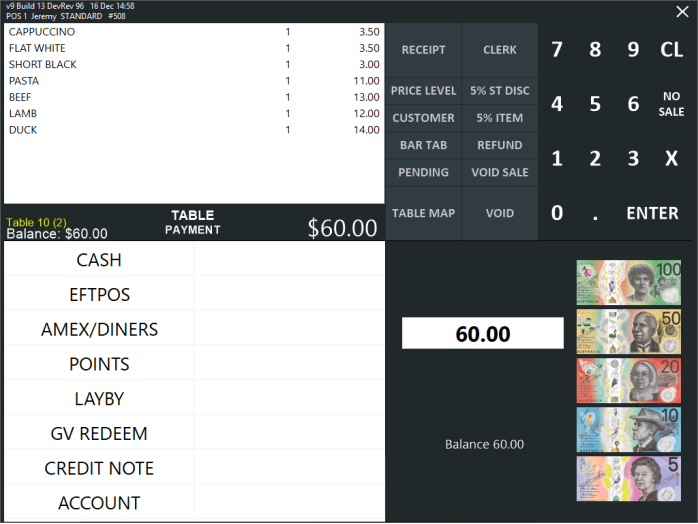 The items from the Table will be shown on the POS Screen > Tender the sale as required.