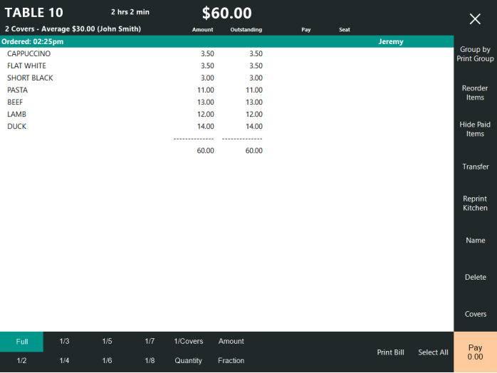 Alternatively, the Table Details can be opened to view all the items on the Table and select individual items to pay.