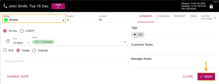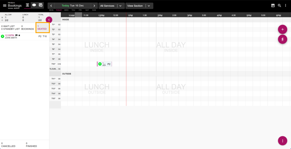 The Reservation will appear under the Seated list on the left-hand side, and will also have its status updated in the Reservations grid.