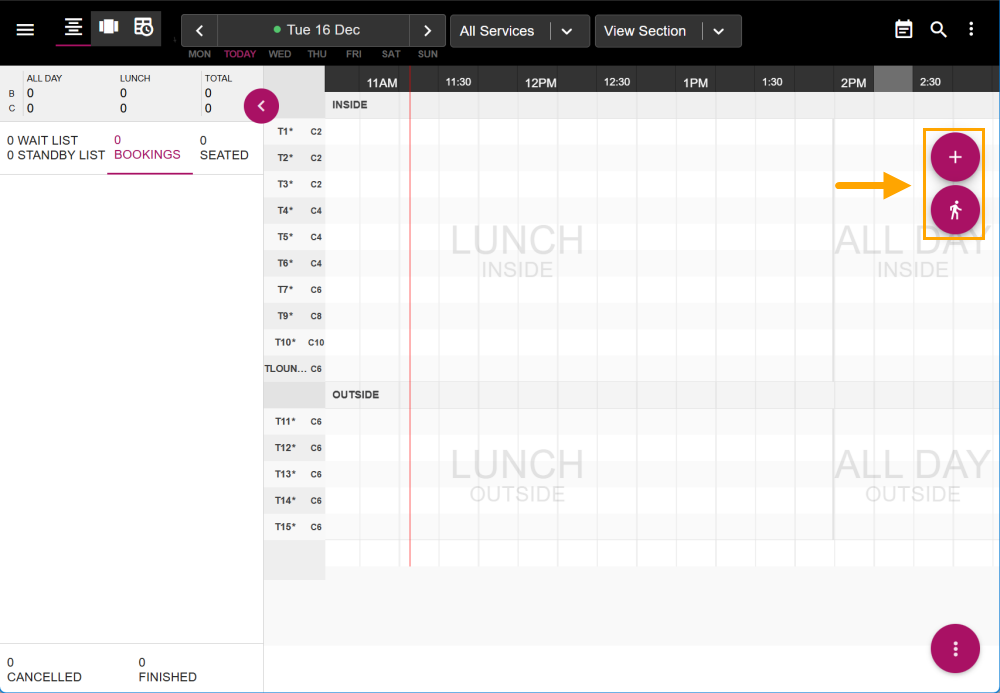 Login to the Now Book It website (https://restaurant.nowbookit.com), then on the top-right corner of the default Bookings page, press the "+" button (to create a Reservation against a Customer name) or press the person symbol (to create a Walk-In Reservation).