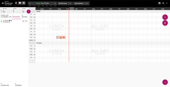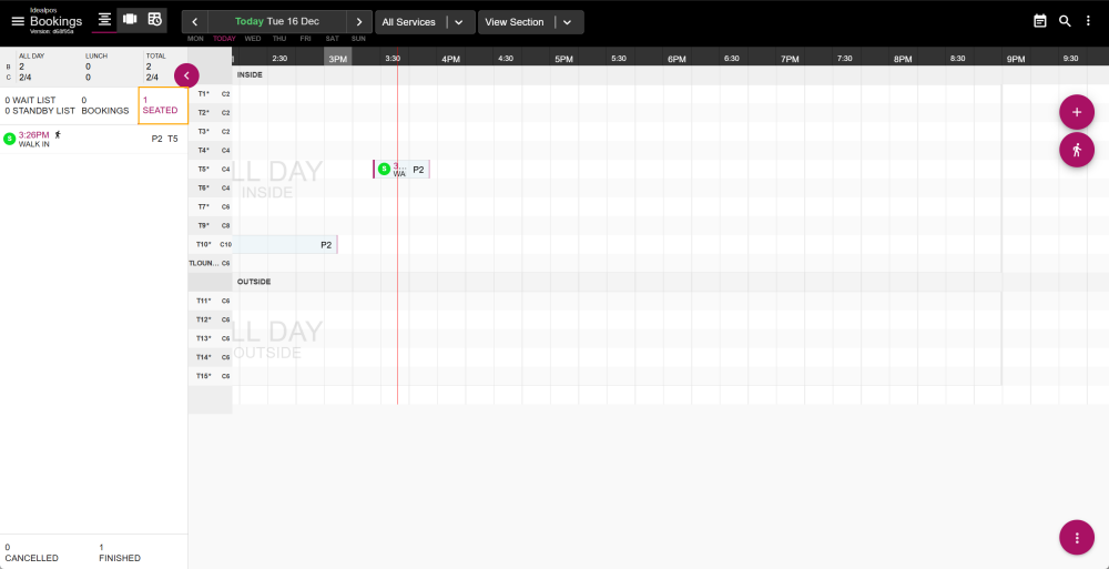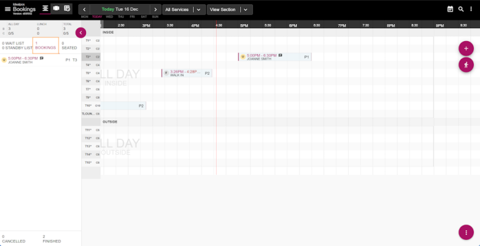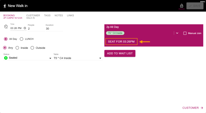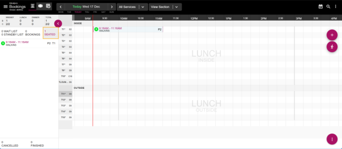 The Walk in reservation will be created for the selected table and will appear on the Seated page of Now Book It.