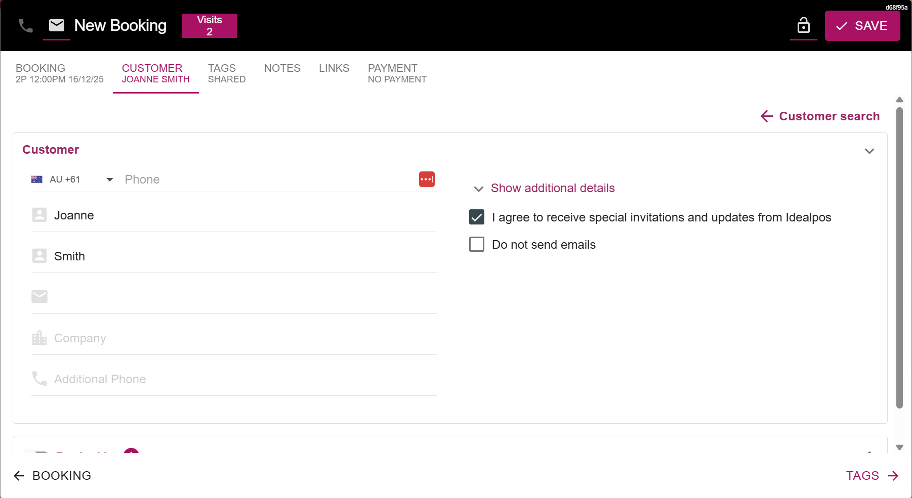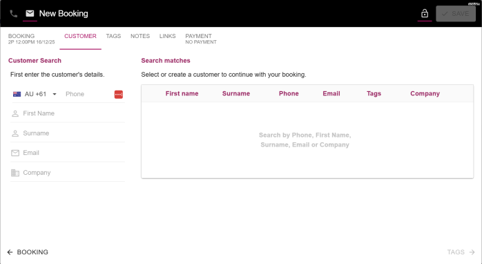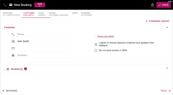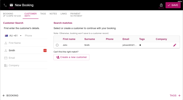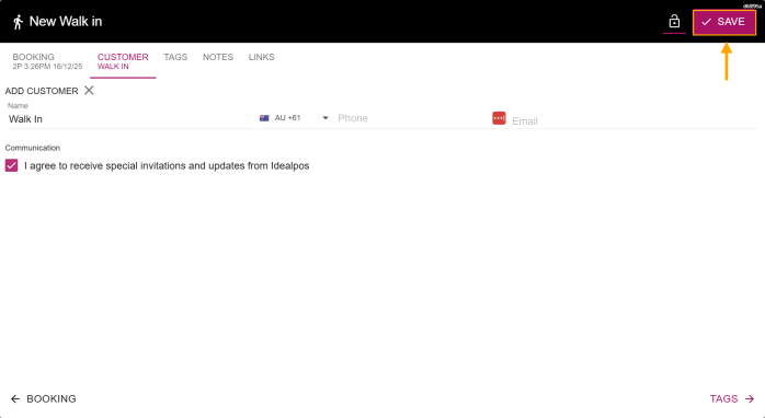 The customer's details will be displayed. Press the "Save" button on the top-right corner to save the customer's reservation.