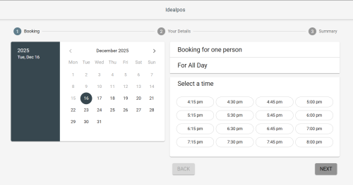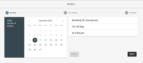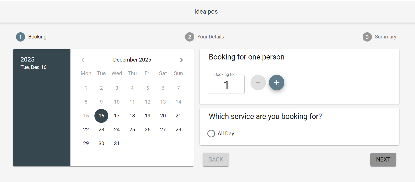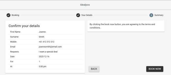 The widget will typically have 3 steps to create a booking; Booking, Your Details and Summary.