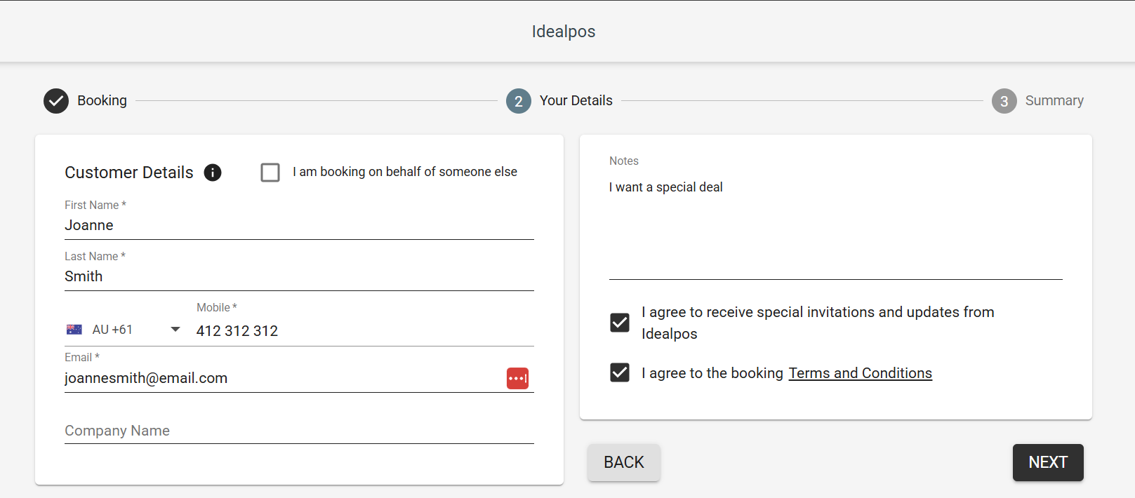 Enter Customer Details (Names, Contact Number, Email) and any notes