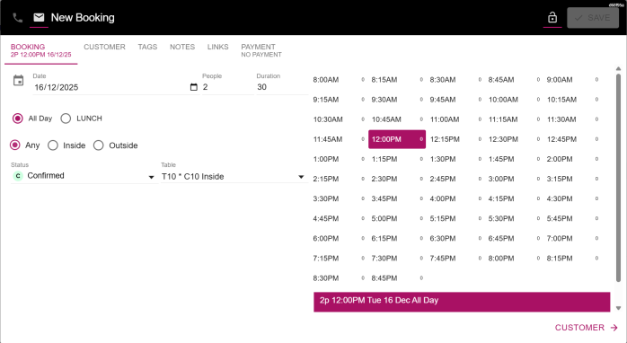Select the Date, Number of people, Duration, Session, Area, Status, Table, Time and enter any other required details, then press the "Customer" button on the bottom-right corner.