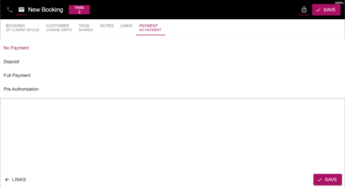 If the venue requires the customer to make a payment prior to their reservation, this can be set in the Payment tab; see New Booking Payment below.