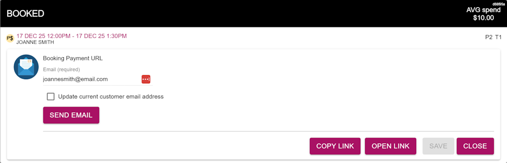 If a Payment Type that requires payment from the customer, a prompt will be displayed with an option to send the Booking Payment URL to the customer's email address via a "Send Email" button.
